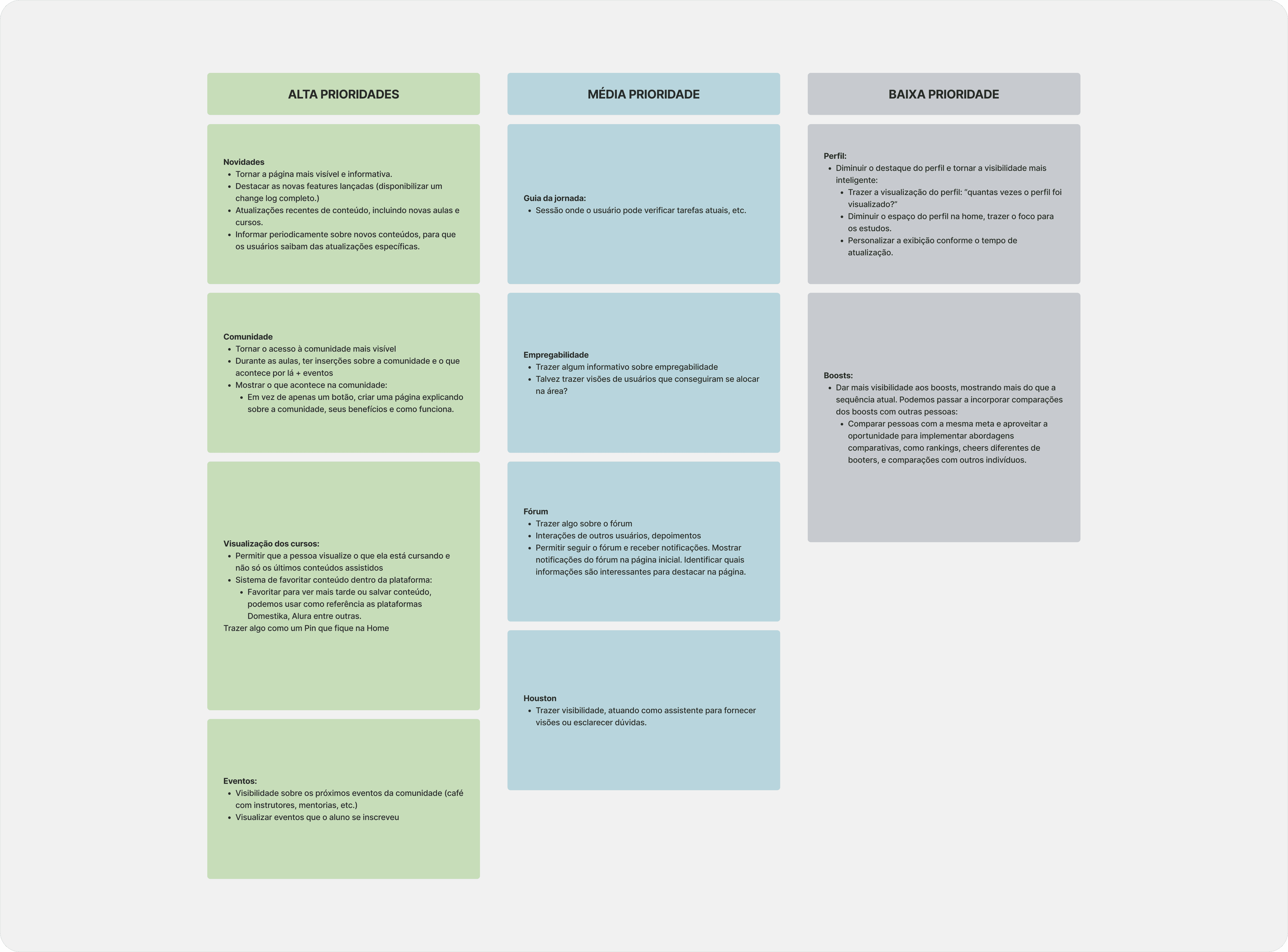 High Priority: We focused on making novelties more visible, facilitating access to the community, and creating a system to 'favorite' content, similar to platforms like Alura and Domestika.