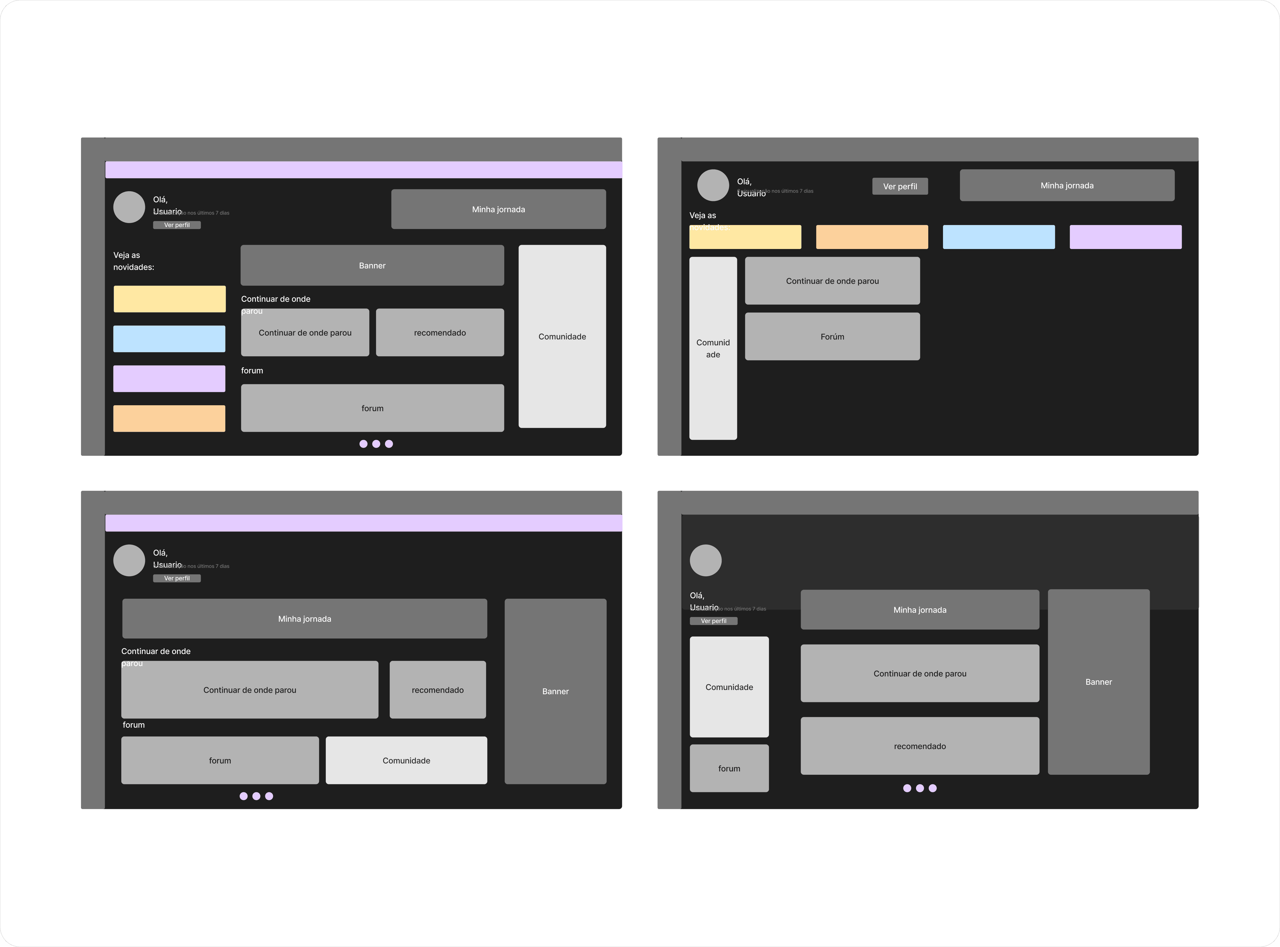 With the references in hand, I drew the first skeletons (wireframes). At this stage, the focus was purely structural: testing where each element (calendar, ongoing courses, community area) would be positioned to ensure that the most important information was always visible "above the fold."