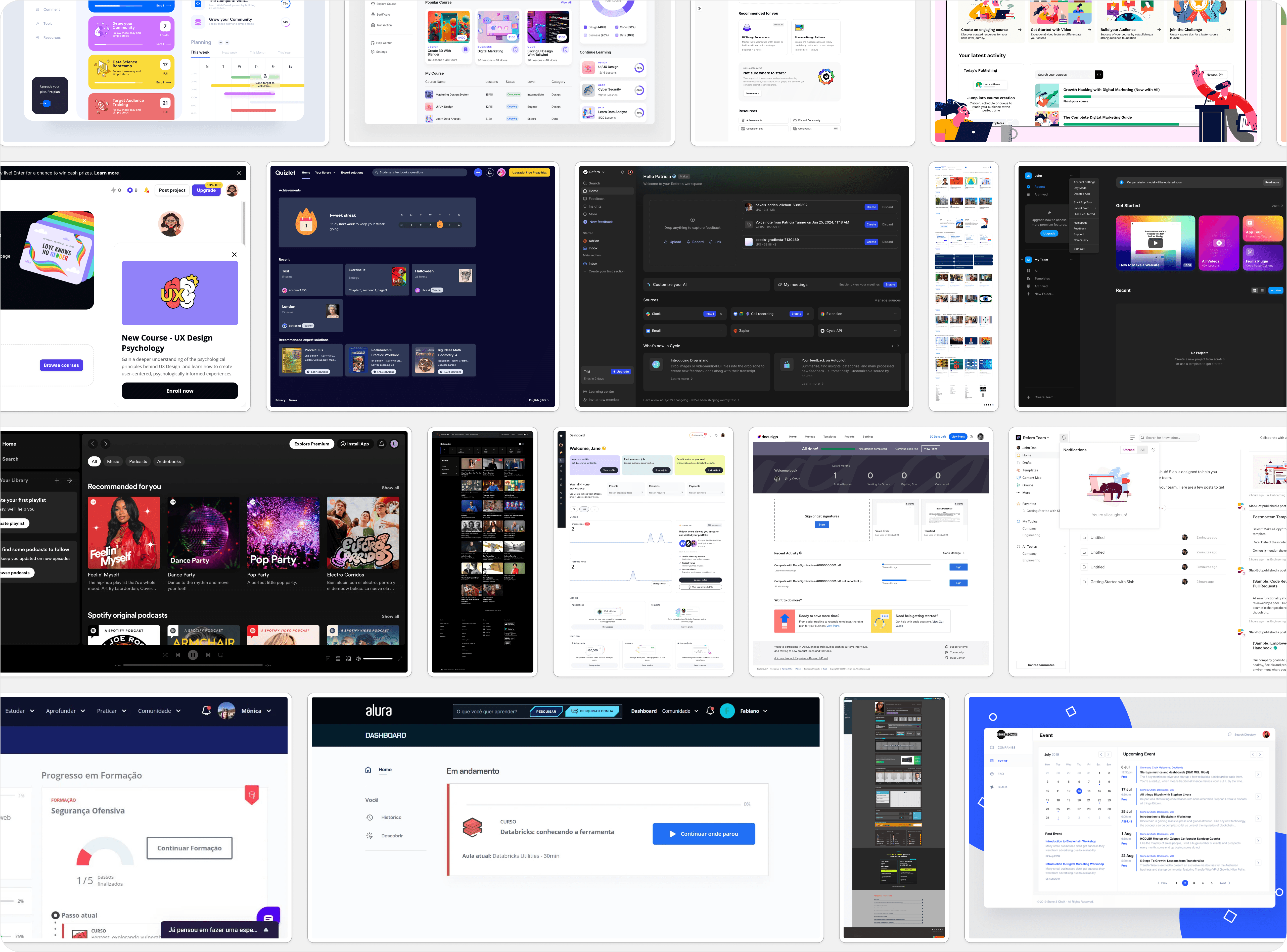 After the Discovery phase, I deep-dived into market research to understand how major education players (like Alura and Domestika) handled the organization of dense content. The objective was to collect usability patterns that were already familiar to our users, reducing the learning curve of the new Home.